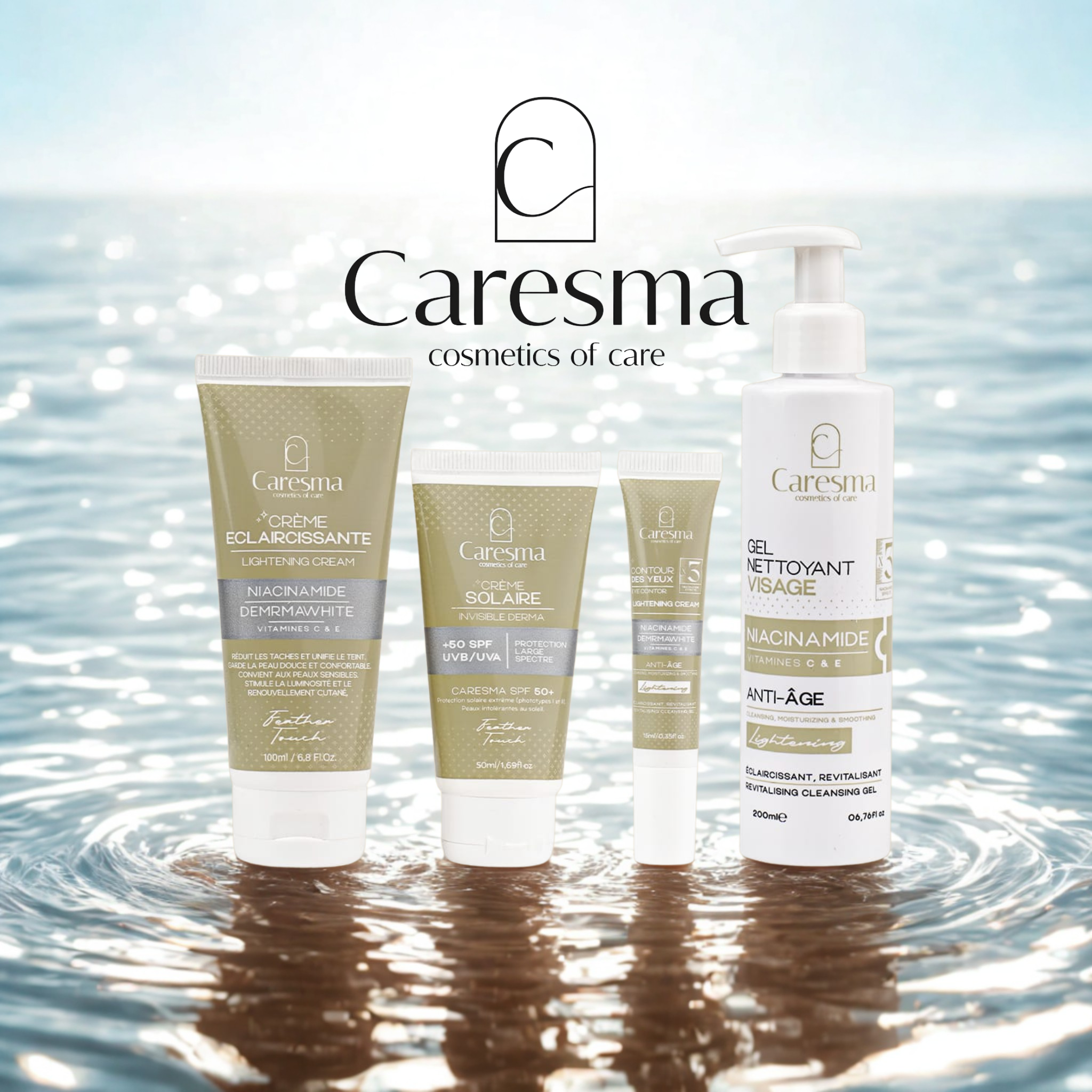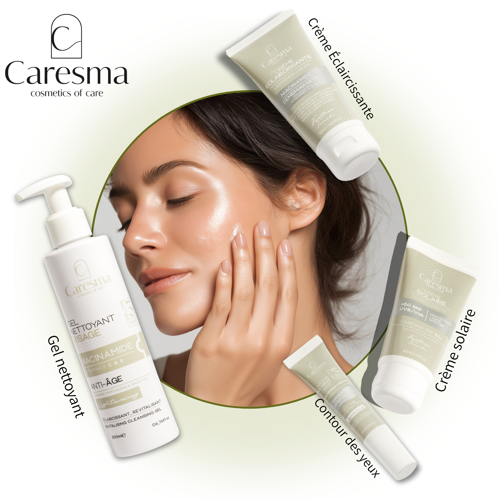 Découvrez la synergie parfaite entre un gel nettoyant purifiant, une crème éclaircissante sublimante, et Crème contour des yeux, Trois gestes essentiels pour une sensation de pureté et d’élégance